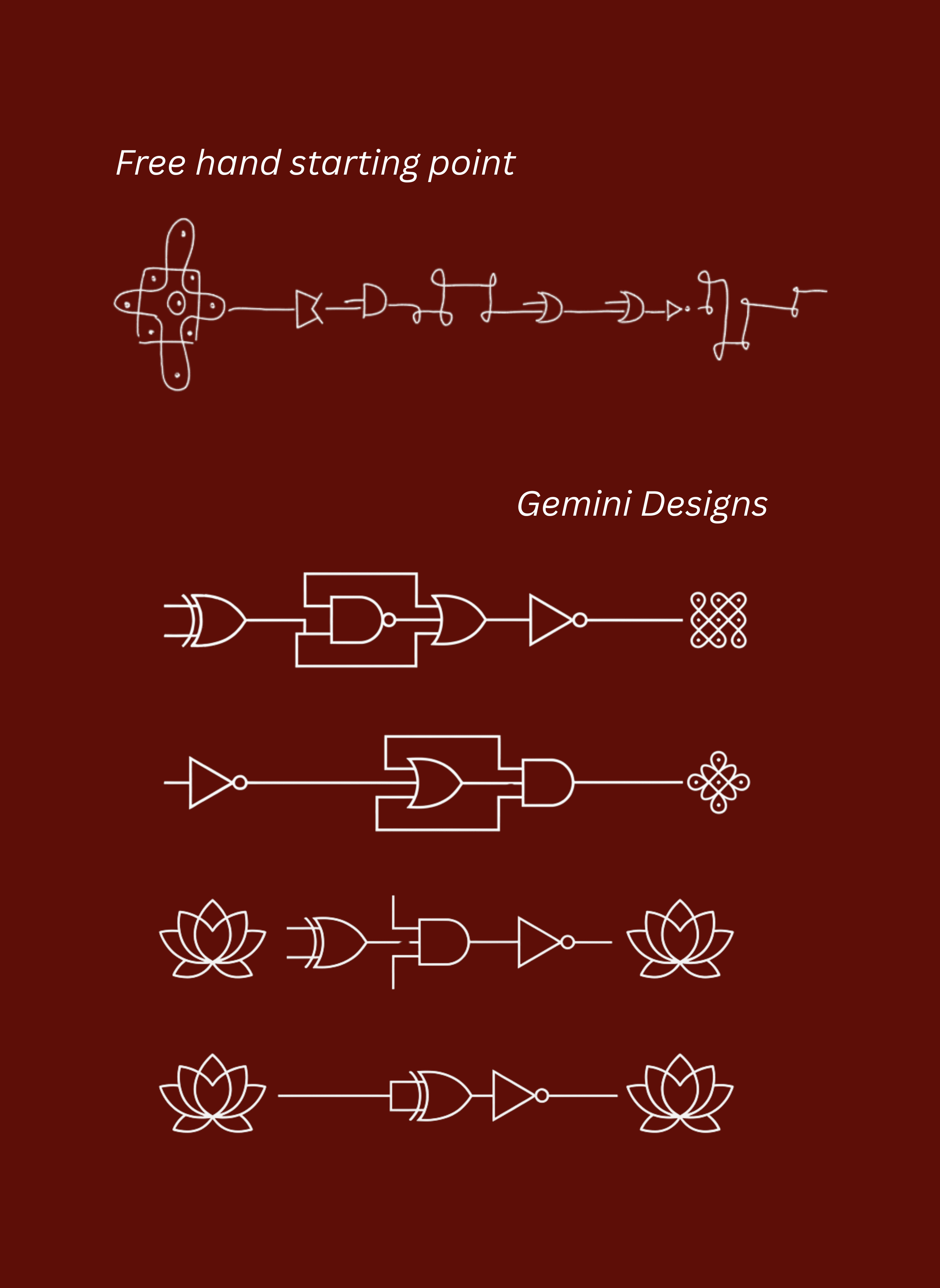 We began by workshopping a few versions of the motif on paper, then fed those sketches into Gemini, which helped generate the more polished interpretations used throughout the website.